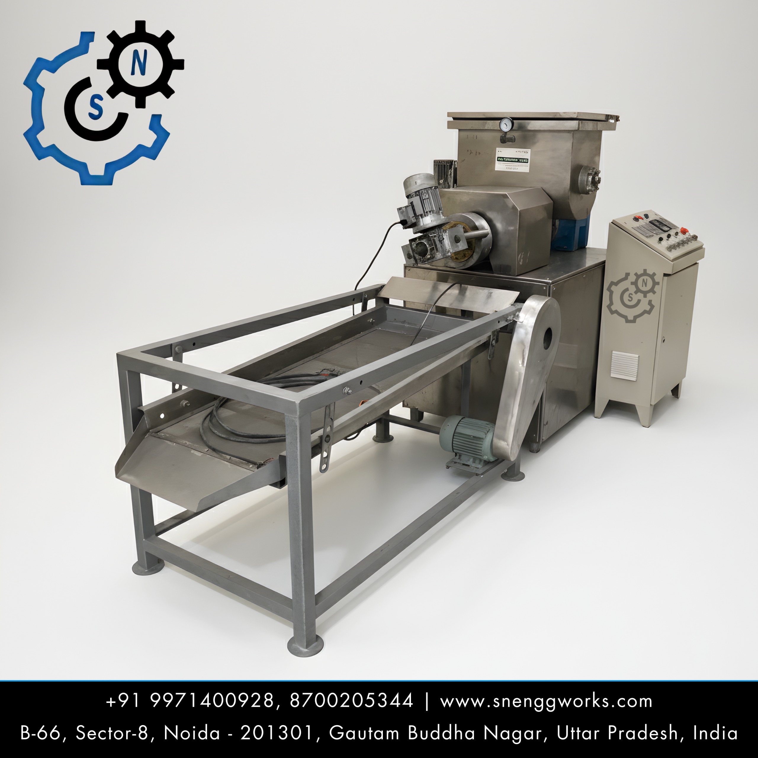 A Kurkure machine is a specialized food processing unit used to manufacture crunchy, ready-to-eat snacks similar to Kurkure. It primarily works on extrusion technology, where raw ingredients such as cornmeal, rice meal, and gram flour are mixed with water and flavoring agents to form a dough. This dough is then fed into an extruder, which cooks it under high temperature and pressure while shaping it into irregular, twisted forms that give the snack its unique texture. The machine consists of several key components, including a mixer, feeder, extruder, cutter, fryer or roaster, seasoning drum, and packaging unit. Inside the extruder, a rotating screw pushes the dough forward, and as it exits through the die, it expands and forms the characteristic curls. The product is then either fried or roasted to achieve crispiness before being coated with spices and flavors. Modern Kurkure machines are highly automated, ensuring consistent quality, hygiene, and efficient production. They are widely used in the snack industry due to their ability to produce large quantities in a short time. These machines play an important role in meeting the growing demand for convenient and tasty snack foods.